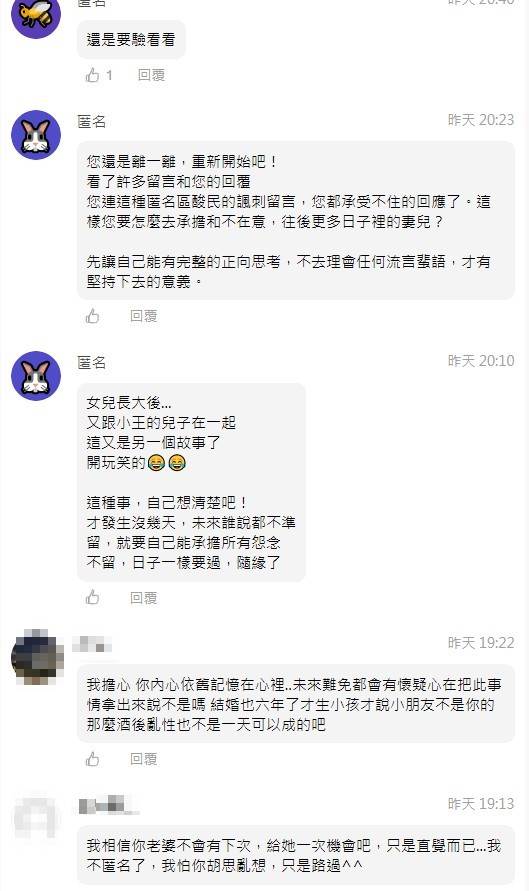 許多網友都勸他:「還是離一離,重新開始吧!」、「未來難免都會起疑,再把這件事拿出來說。」、「要不給她一次機會吧?」也有人建議他去驗看看,對此他也回應,看過那位同事的照片,跟女兒非常像,結果可想而知。