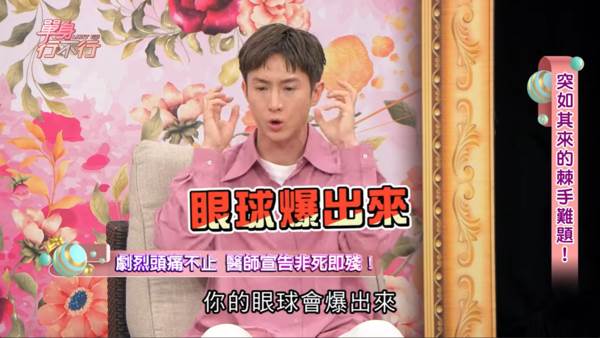 但與上一名醫生所說的不同,這名醫師直言,這種病癥還可能造成「眼球爆出」的可怕後果,讓阿本當場原地嚇傻,更懷疑自己是被他人惡整。而這段經歷一分享完,在場來賓也面面相覷,完全不敢相信。