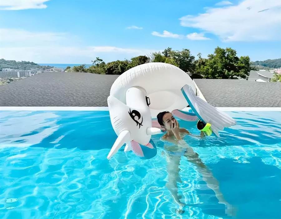 特別是其中一張照片,引起了許多媒體和網民的質疑。那是一只獨角獸游泳圈,上邊坐著黃家四姐妹和兩個孩子。