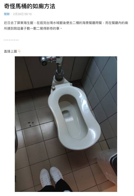 根據《ETtoday》報導,有名女網友在網站「Dcard」上分享奇特經歷,表示自己近日到屏東海生館遊玩,中途休息時到海景餐廳用餐,卻在餐廳廁所內遇見「這輩子數一數二覺得新奇的事」!原來她在廁所內看到奇特造型的馬桶,