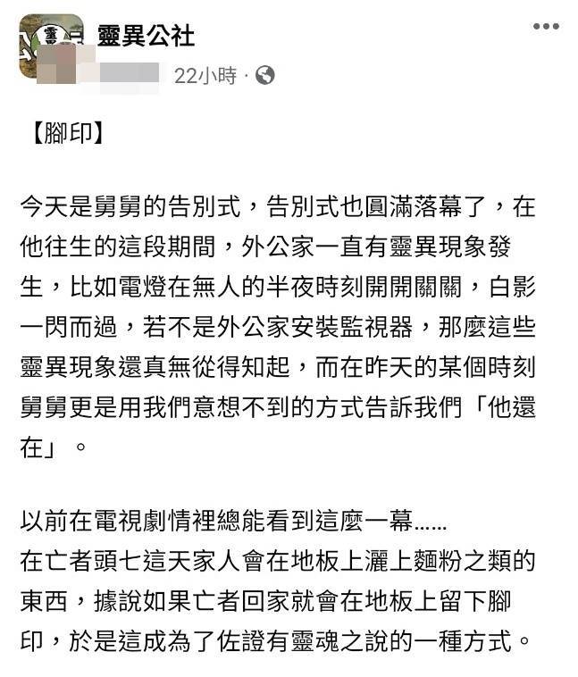 據《三立新聞》報導,一名網友昨(12)日在臉書社團「爆料公社」發文表示,昨天是舅舅的告別式、圓滿落幕了,指稱在舅舅往生的這段時間,外公家一直有難以解釋的靈異現象發生,在監視器畫面下,電燈在無人的半夜時刻開開關關、白影一閃而過。
