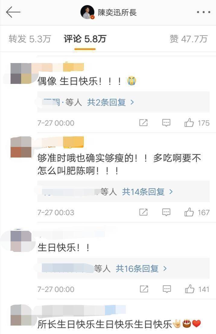這個發際線確實是有點突然,都快移到頭頂上去了,髮量也比較少,跟陳奕迅簡直是同款髮型。網友們在下面搞笑評論說:「這發際線在清朝起碼是個貝勒」,粉絲連忙艾特陳奕迅,開玩笑的表示:「肥陳,有人在你生日的時候黑你!」