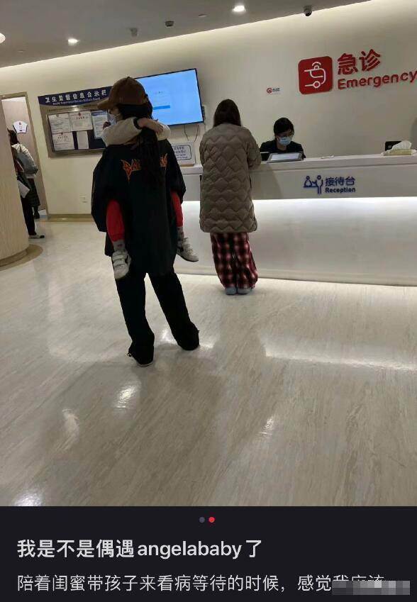 網友透露,Angelababy昨日(23)晚間現身上海的某間醫院,曝光照片中,她戴著鴨舌帽、口罩,素顏看起來神情憔悴,緊抱著孩子坐在診間,且小朋友戴著口罩,看起來狀態虛弱,推測是是兒子小海綿發燒,同行還有一位阿姨。PO照網友原本陪伴友人去醫院,沒想到目擊大明星,強調多次確認是本人。