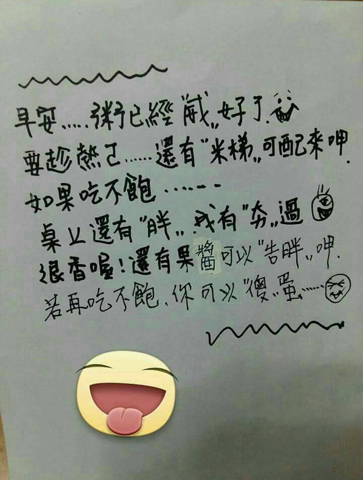 根據ETtoday報導,最近有網友在臉書《爆廢公社》附上一張字條,從畫面中可以看到字條寫著:『早安,粥已經「威」好了,要趁熱喔,還有「米梯」可配來呷。如果吃不飽,桌上還有「胖」,我有「夯」過,很香喔!還有果醬可以「告胖」呷。若再吃不飽,你可以「傻蛋」。』,並在文末詢問大家是否有人看得懂。