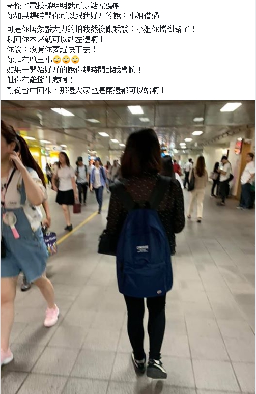 在台北市搭乘捷運時,一位姑娘的舉止引發了討論。當她站在手扶梯的左側時,被后方的民眾責備,要求她讓行。然而,姑娘卻不認為自己做錯了,回嘴說左邊可以站人,詢問態度差是怎麼回事。