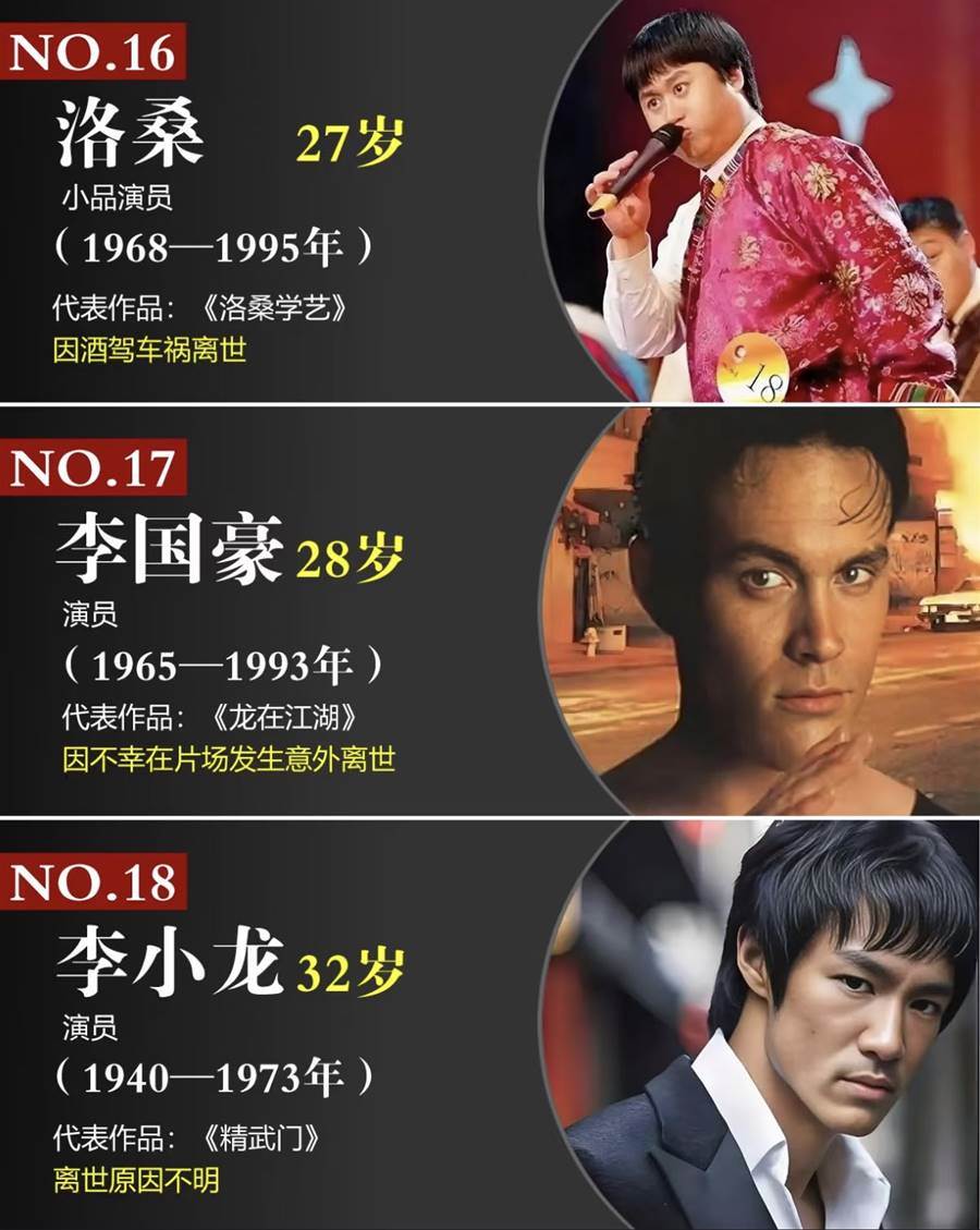 李小龍:32歲演員(1940-1973年)代表作品:《精武門》離世原因不明。