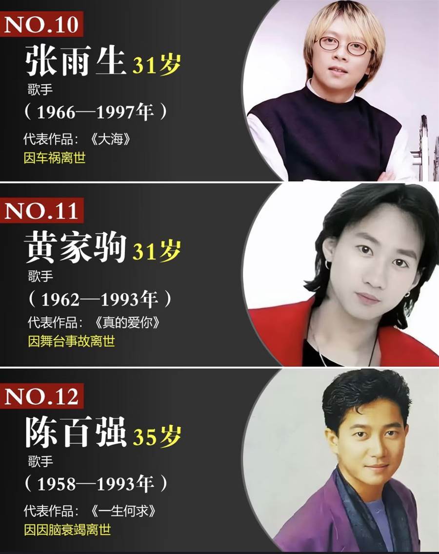 陳百強:35歲歌手(1958-1993年)代表作品:《一生何求》因因腦衰竭離世。