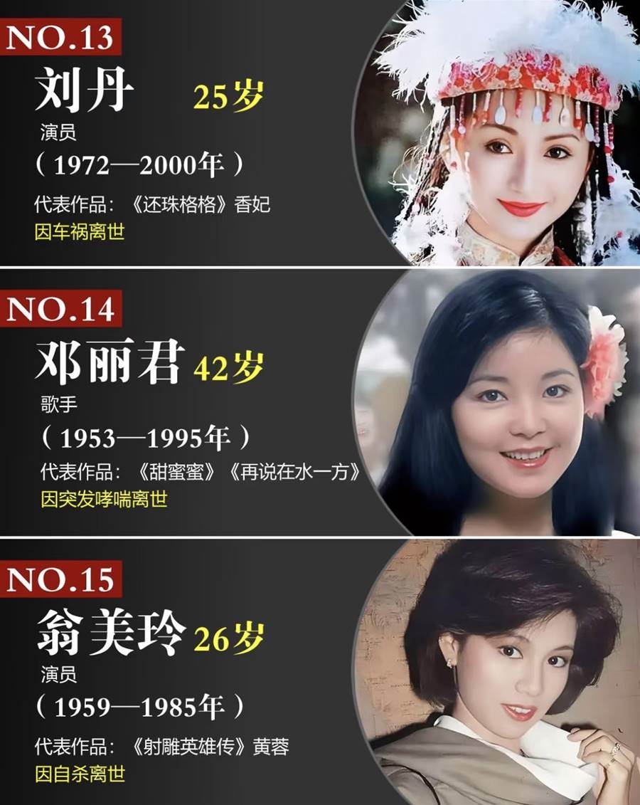 劉丹:25歲演員(1972-2000年)代表作品:《還珠格格》香妃因交通事故離世。