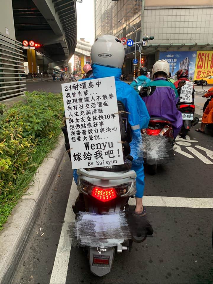 之前也有網友拍到路上一名騎士為了跟交往10年的女友求婚,展開超辛苦的「24耐環島」,身邊還有兩位好友義氣相挺陪伴,真的太有趣了XD