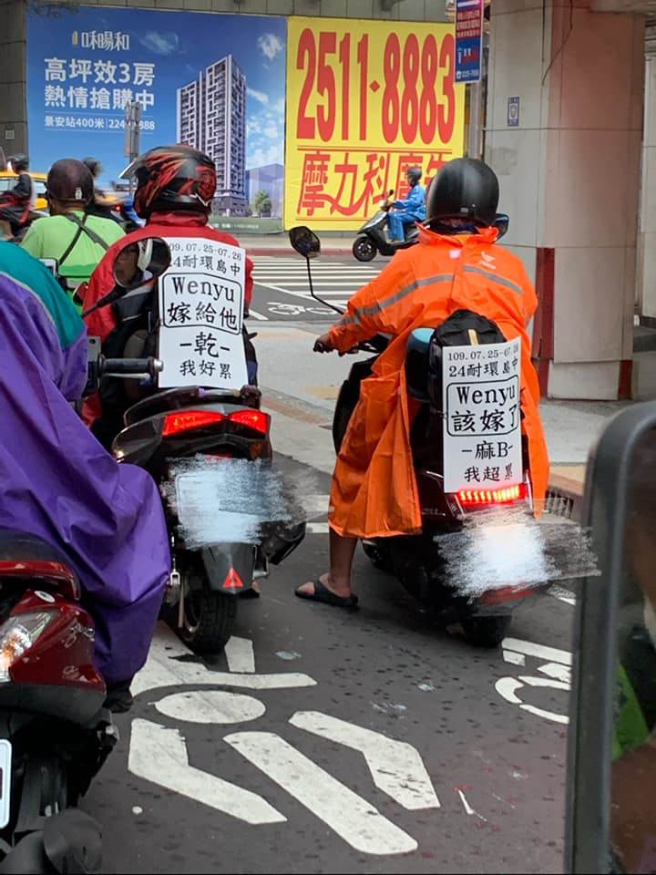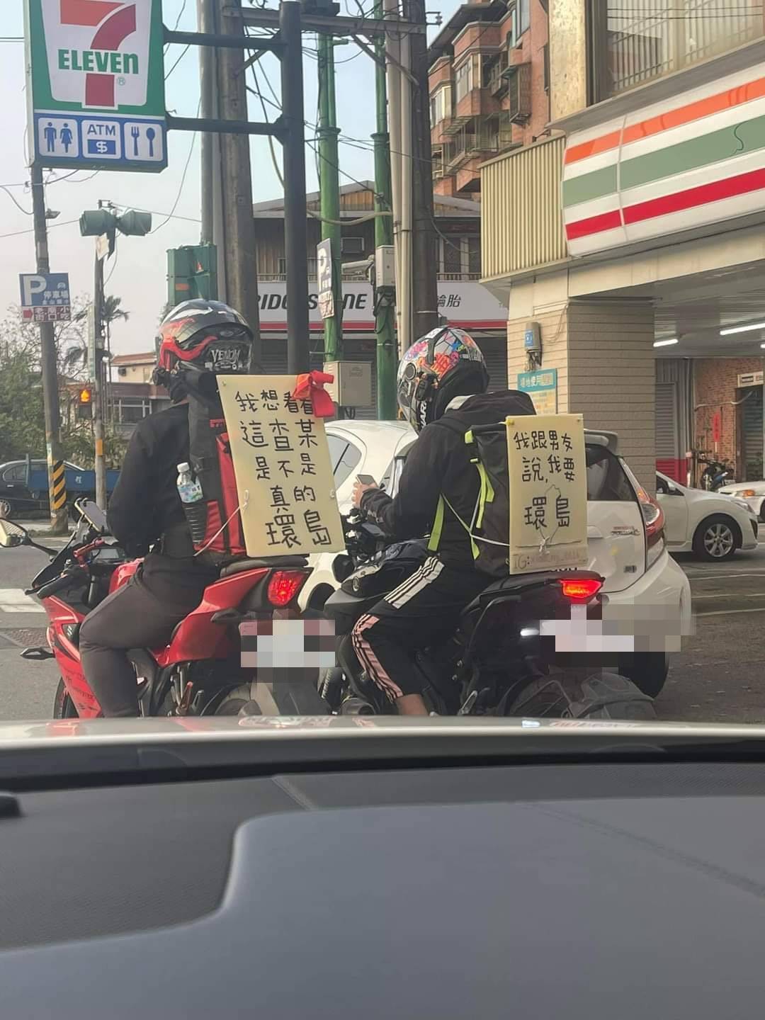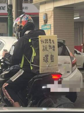 原來男友身上掛著寫了「我想看看這查某是不是真的環島」的板板!兩人併排等紅燈的時候看板就好像在隔空甜蜜鬥嘴,讓周遭的路人都忍不住掏出手機拍下這可愛的一幕~
