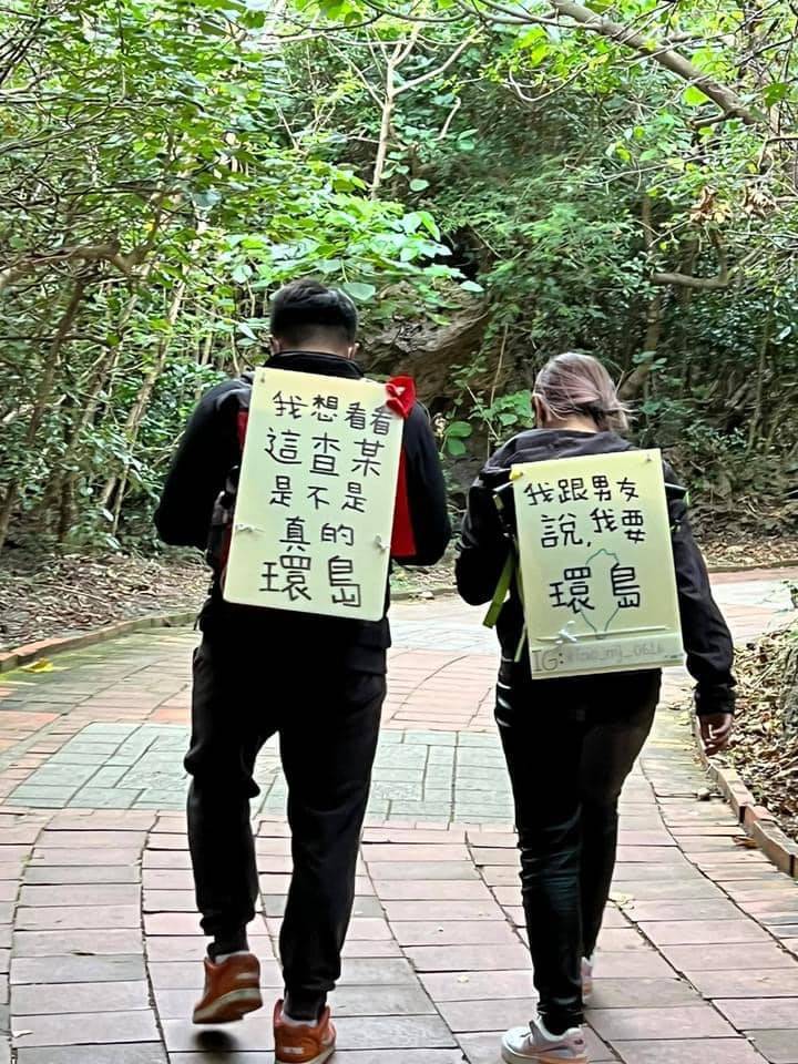 日前就有人在馬路上看到一對超可愛的環島情侶檔,兩人身上都揹著大大看板,女方身上的板子寫著:「我跟男友說我要環島」,而隔壁男友身上的看板則令人忍不住笑出聲...