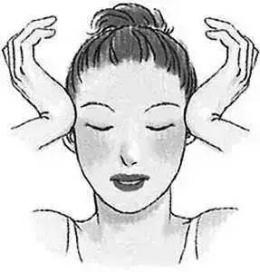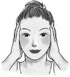 用手掌根部按壓住太陽穴。用同樣的方法按壓上腭骨和下顎骨之間的肌肉。這時嘴巴要稍微張開,使得肌肉可以受到更加強烈的刺激。利用雙手指尖按壓耳根到下巴之間的部位。時間約為 3 ~ 5 秒鐘。