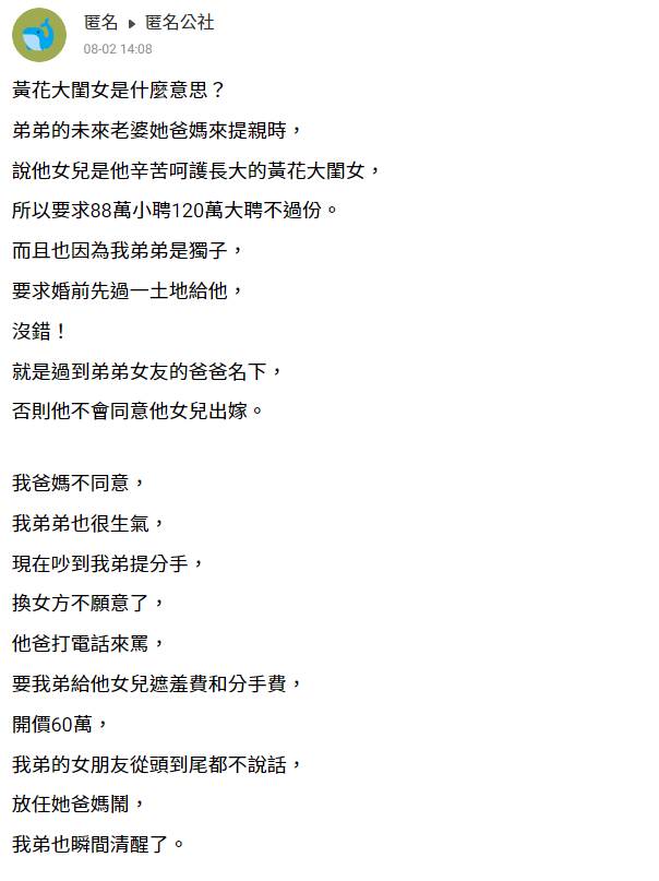 據《ETtoday》報導,原PO近日在匿名公社上發文抱怨,弟弟與女友交往快兩年,女方爸媽最近來家裡提親時,說他們的女兒是「黃花大閨女」,所以要求要大聘120萬、小聘88萬不過份,而且還提出更過分的要求,女方爸爸認為,由于弟弟是獨子,所以婚前要先過戶一塊土地給他,「沒錯!就是過到弟弟女友的爸爸名下,否則他不會同意他女兒出嫁」。
