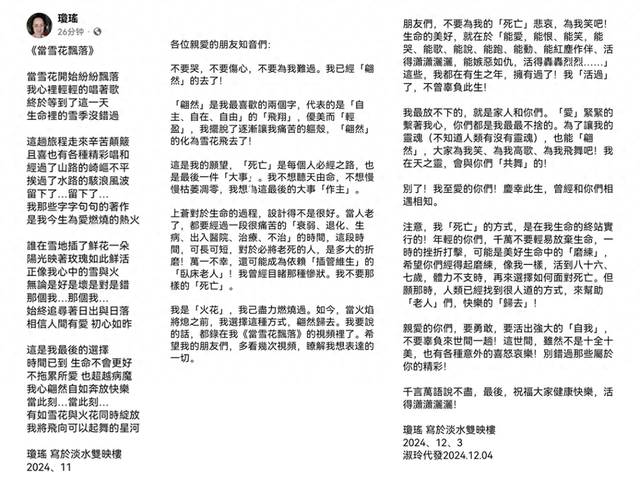 去年年底,瓊瑤女士在台北家中去世,享年86歲。她的「翩然離去」,讓全網掀起一場對生命的探討。