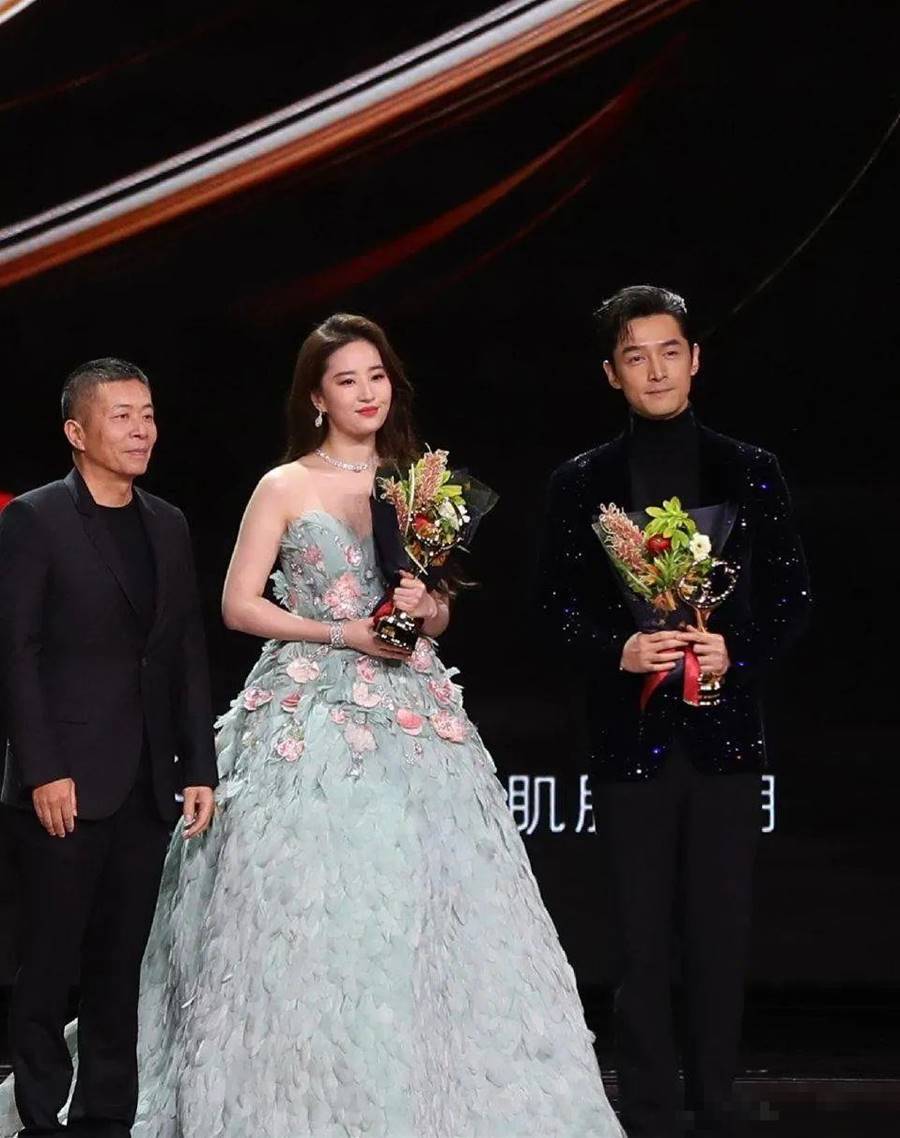 在一次頒獎晚會上,劉亦菲和胡歌一同登台領獎。劉亦菲那晚選擇了一件藍色羽毛禮服作為裝扮,還搭配了一款中式貴氣感妝容,整個人自信而大方,散發出迷人魅力。