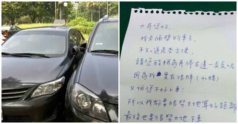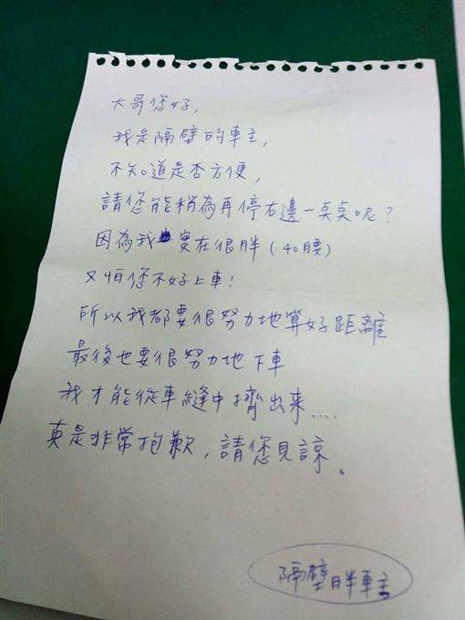 如此有禮貌的開頭後,對方繼續寫:「因為我40腰,又怕您不好上車!所以我都要很努力地算好距離,最後也要很努力地下車,我才能從車縫中擠出來....真是非常抱歉,請您見諒。」最後並附上「隔壁胖車主」的署名,一曝光紙條就引起討論。