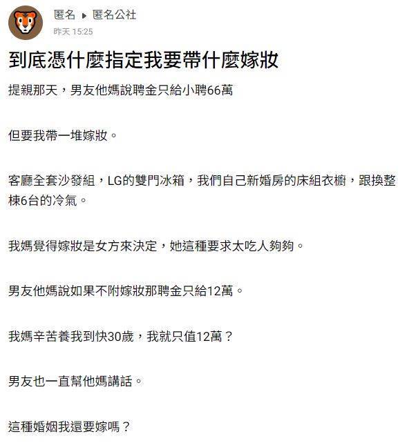 「男友他媽說,如果不附嫁妝、那聘金只給12萬。我媽辛苦養我到快30歲,我就只值12萬?男友也一直幫他媽講話,這種婚姻我還要嫁嗎?」其實,不管是聘金或是嫁妝,原意都是美好的祝福,現在卻被拿來談論價碼,讓網友們都紛紛搖頭...