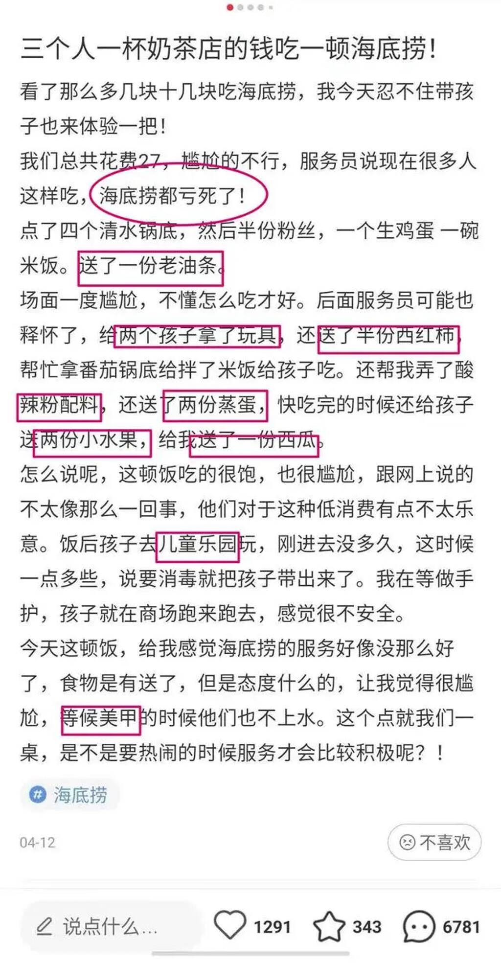 另外一位媽媽帶著兩個孩子去海底撈就餐,點了四份清水鍋、半份粉絲、一顆生雞蛋和一碗米飯。服務員不僅送上了油條、番茄、蒸蛋和水果,還給孩子們提供了玩具。總共花費只有27元。然而,這位媽媽卻對海底撈的服務感到失望,認為服務員的態度讓她感到尷尬。